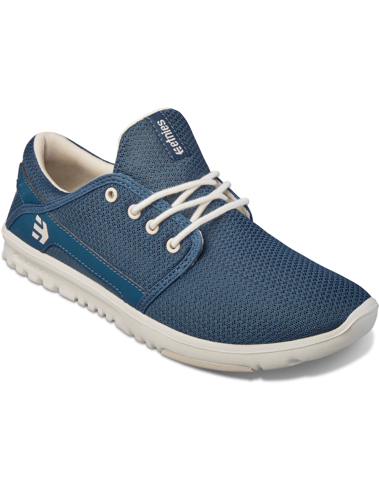 Baskets Etnies Scout bleu/blanc avec semelle intérieure Etnies Foam Lite et Plant a Tree. Fabrication vegan. La marque comprend un logo Etnies imprimé et une étiquette Etnies tissée. Tige en synthétique. Fabriqué en caoutchouc et synthétique.