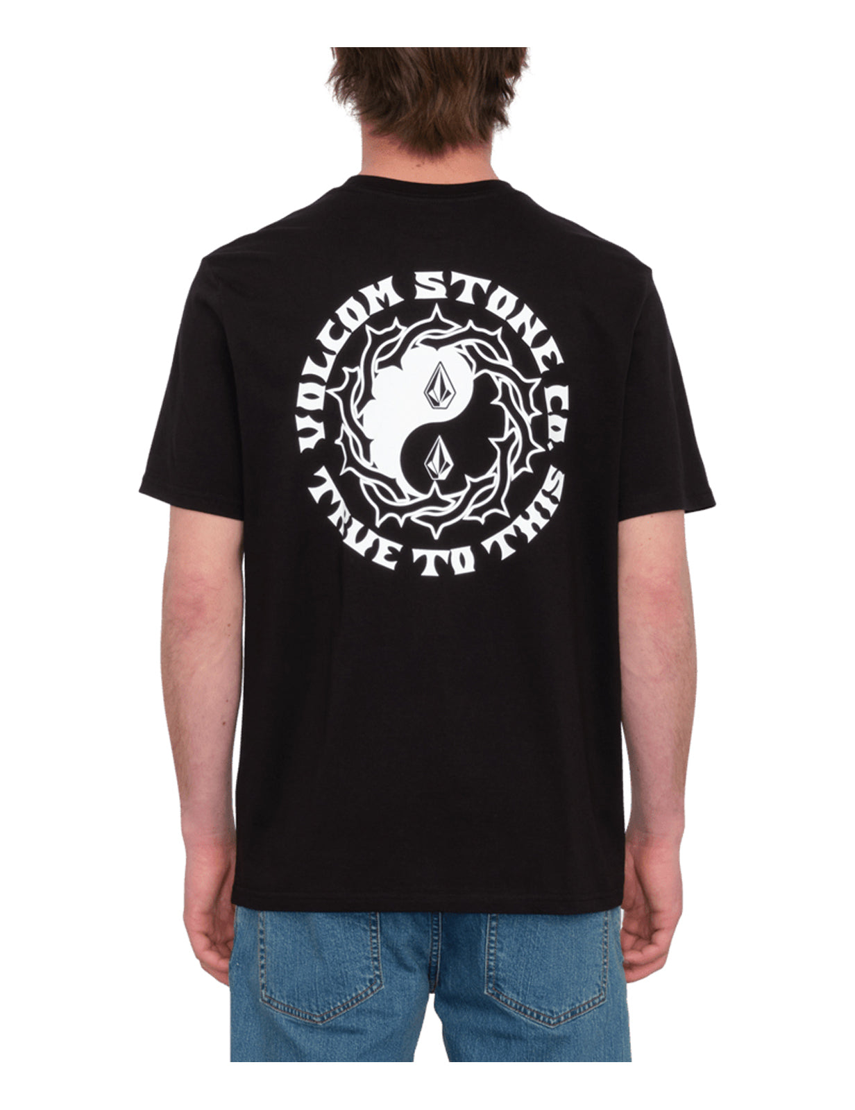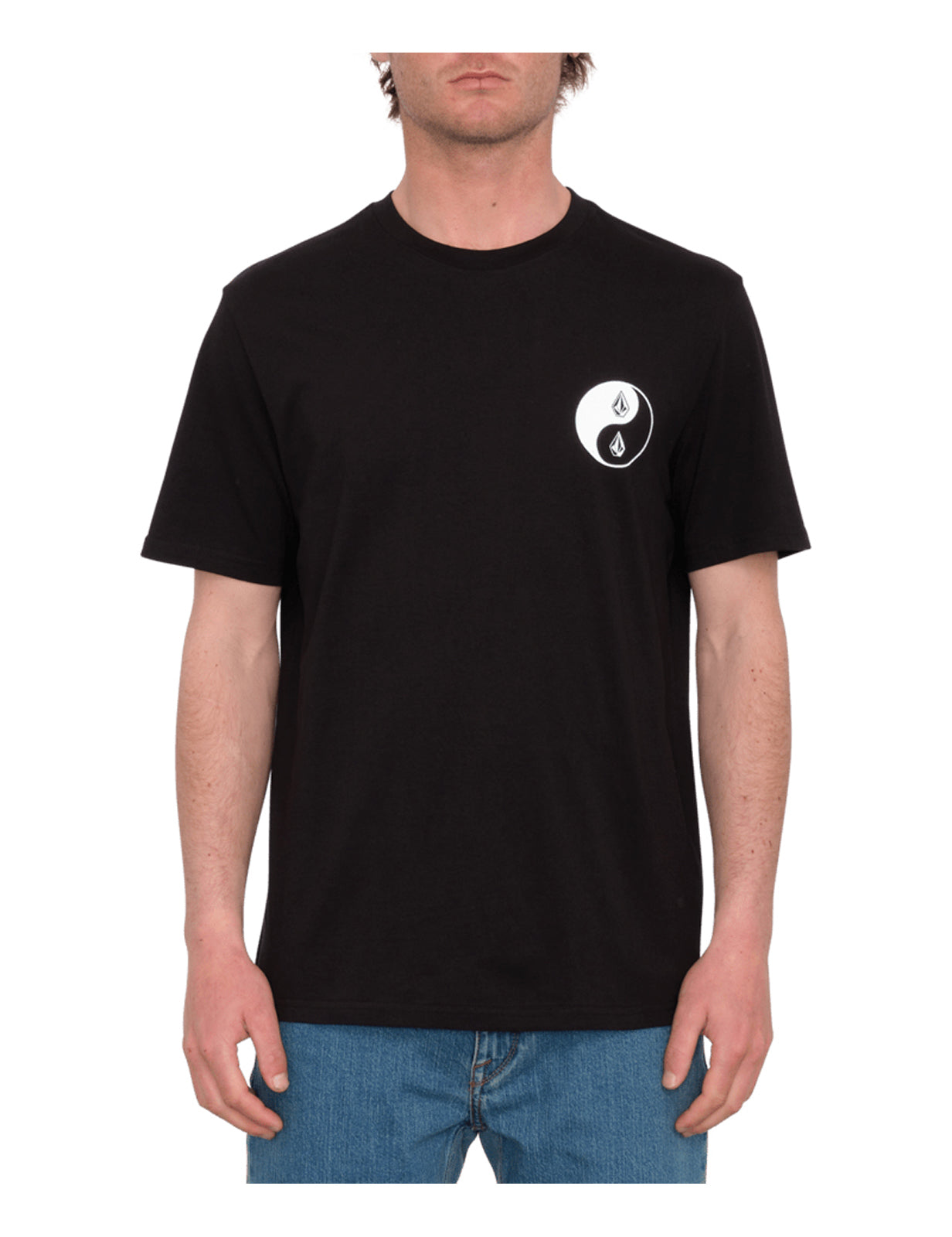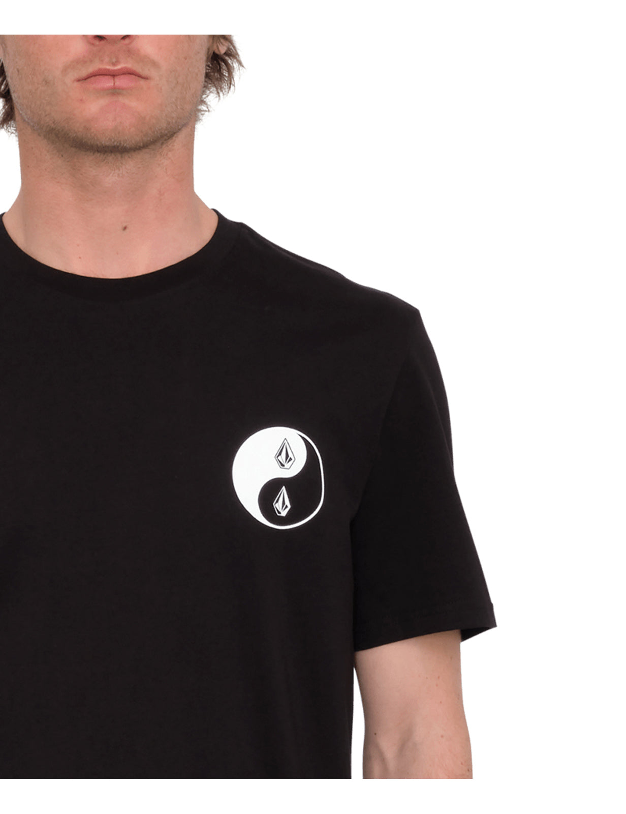 Volcom Counterbalance modern fit short sleeve t-shirt in black features Volcom Farm to Yarn. Also features a eco aware manufacture. Branding includes a Volcom logo chest print and Volcom woven label. Made with organic fabric. Made from 100% cotton.