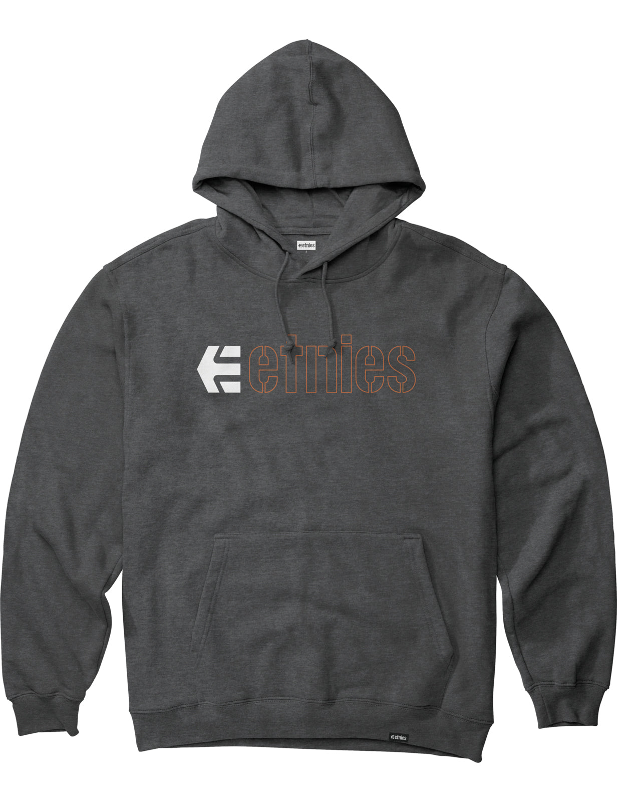 Etnies Ecorp regular fit pullover hoody in charcoal/heather features a adjustable drawstring hood and pouch pocket. Branding includes a Etnies logo chest print and Etnies woven label. Made from 80% cotton and 20% polyester.