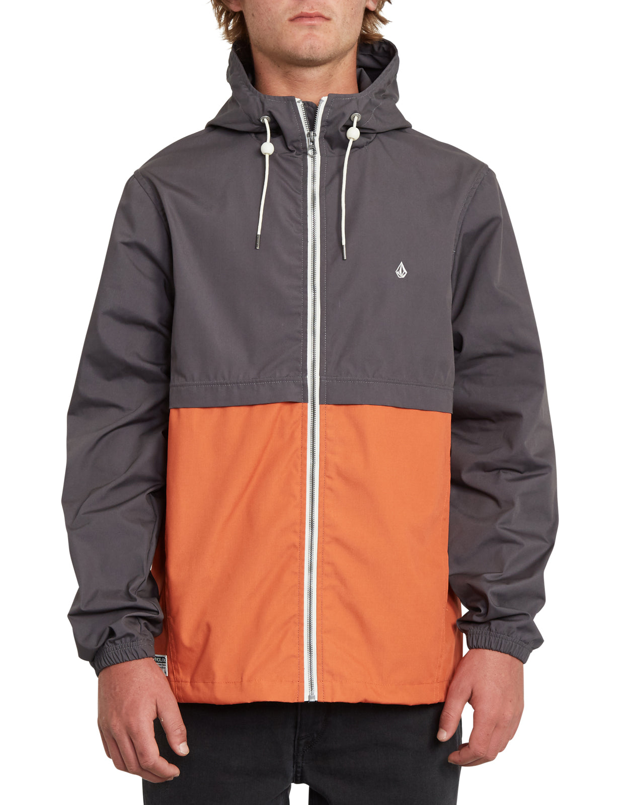 Volcom Howard Hooded shell jacket in burnt orange features 2 pockets and drawstring hem as well as drawstring hood, elastic cuffs and zip closure. Branding includes a Volcom embroidered logo and Volcom woven patch. Made from 65% polyester and 35% cotton.