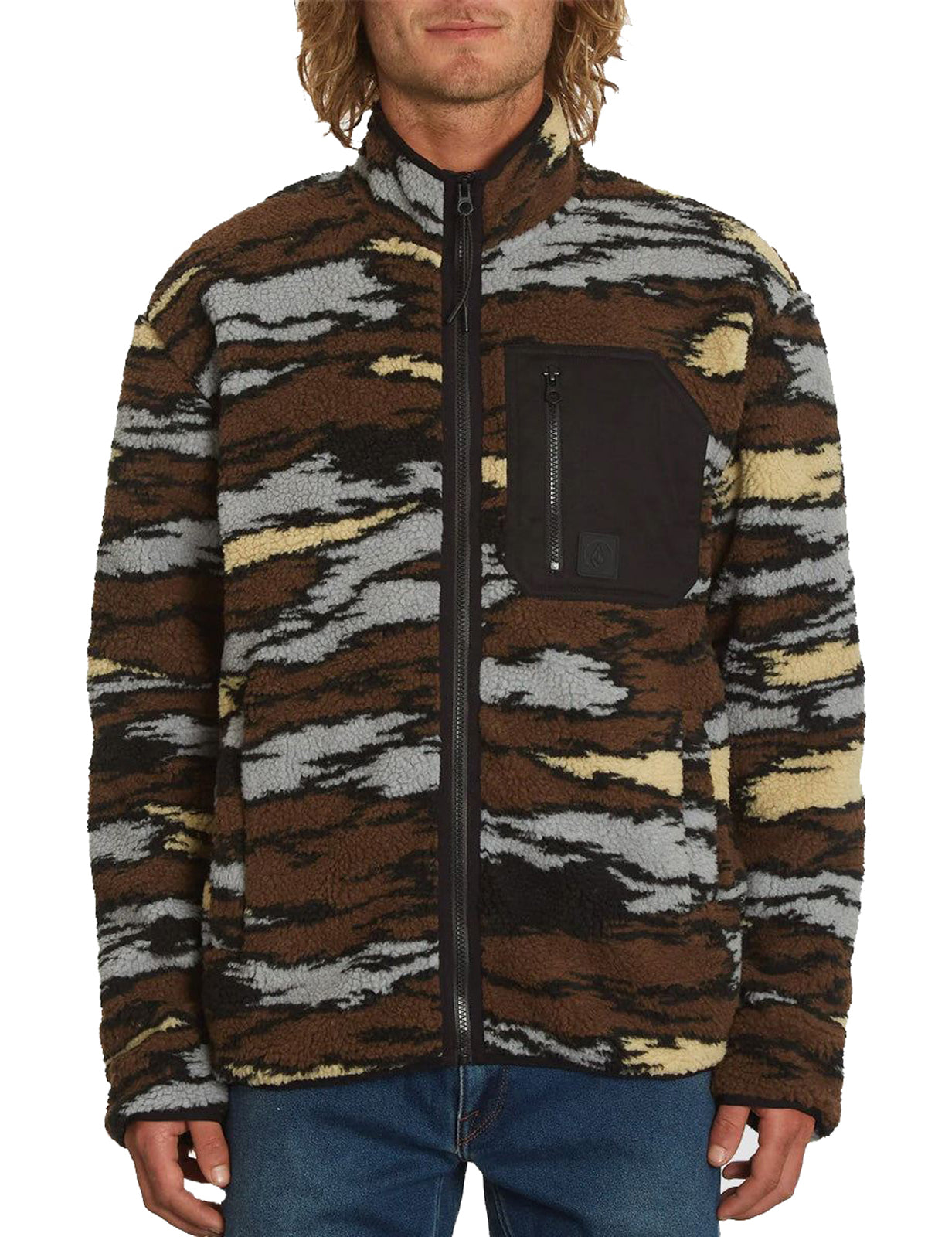 Volcom Muzzer Fuzzar Zip relaxed fit full zip fleece in bark brown features side pockets. Branding includes a Volcom rubber patch. Made with polar fleece, sherpa fleece. Made from 100% polyester.