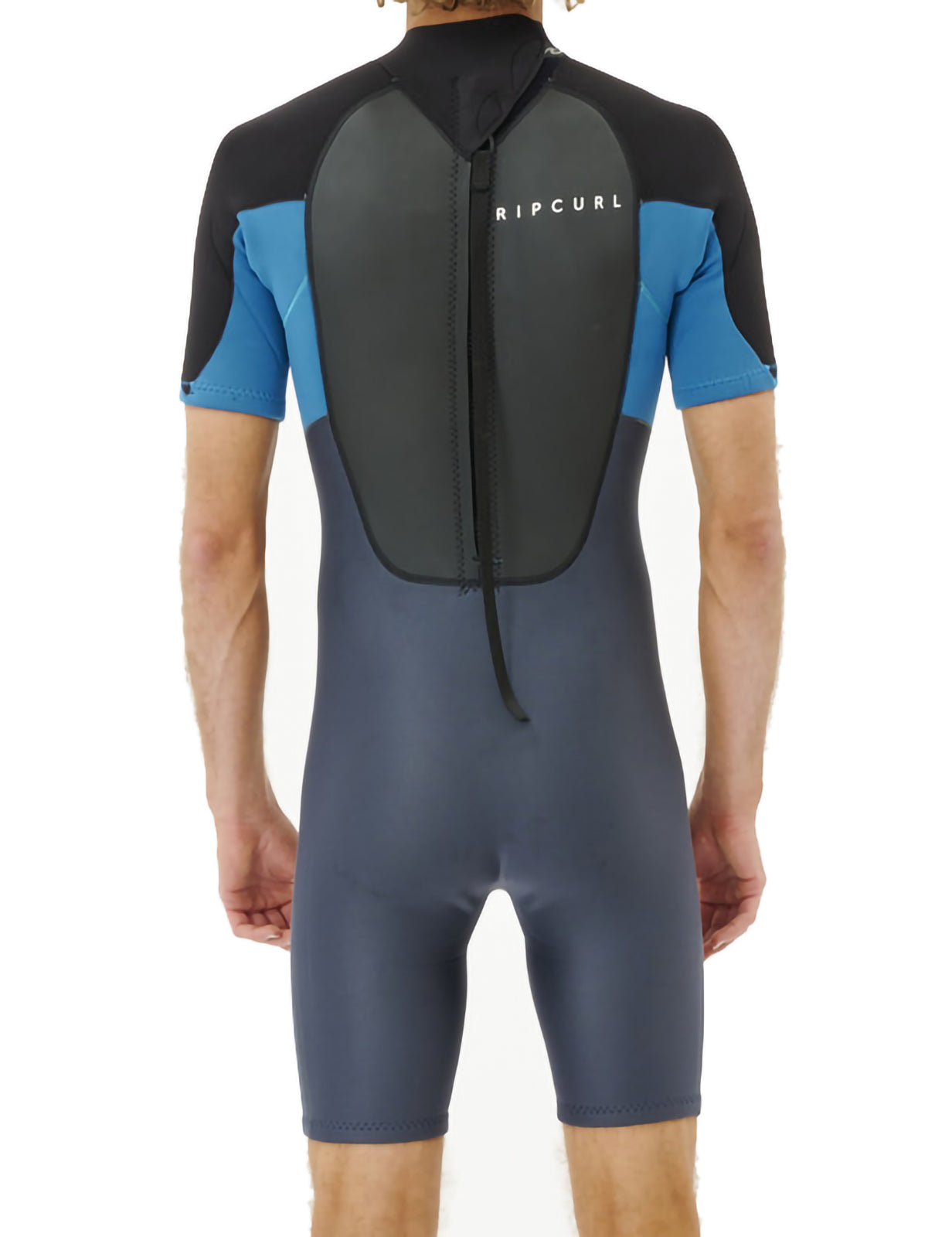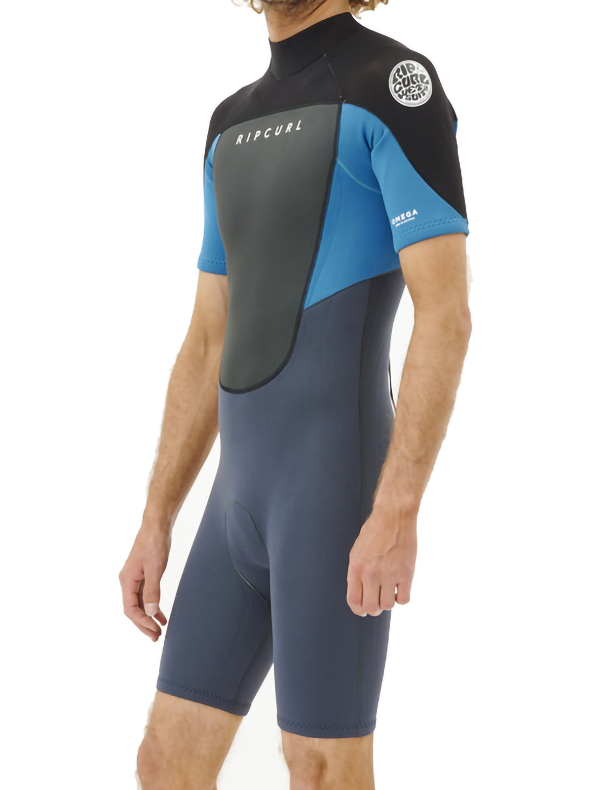 Rip Curl Omega 2mm Back Zip Spring wetsuit in blue for men. Branding includes a Rip Curl printed logo. Made from 80% neoprene and 20% polyamide.