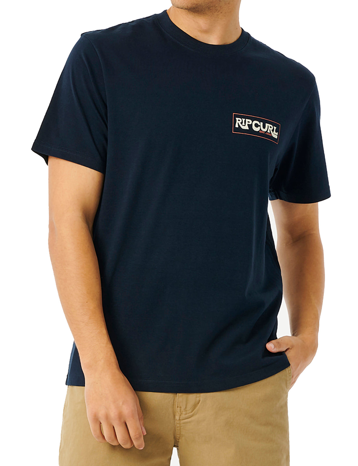Rip Curl Pacific Rinse Reef relaxed fit short sleeve t-shirt in dark navy features a rear print. Branding includes a Rip Curl logo chest print and Rip Curl woven label. Made with cotton jersey. Made from 100% cotton.