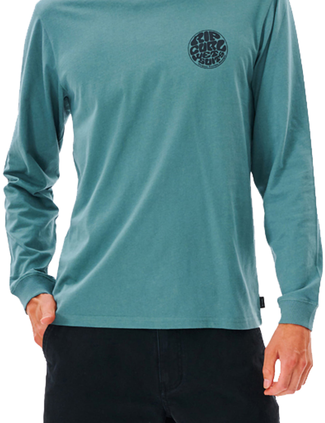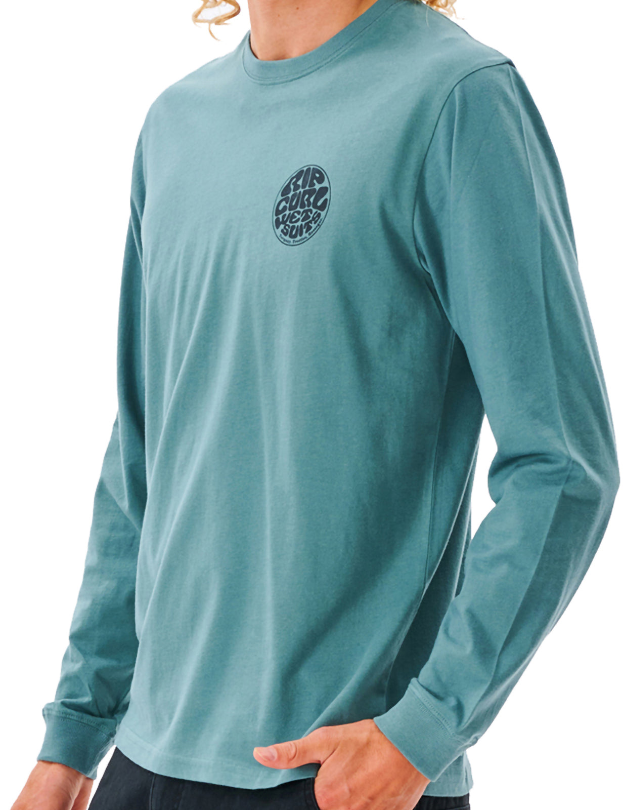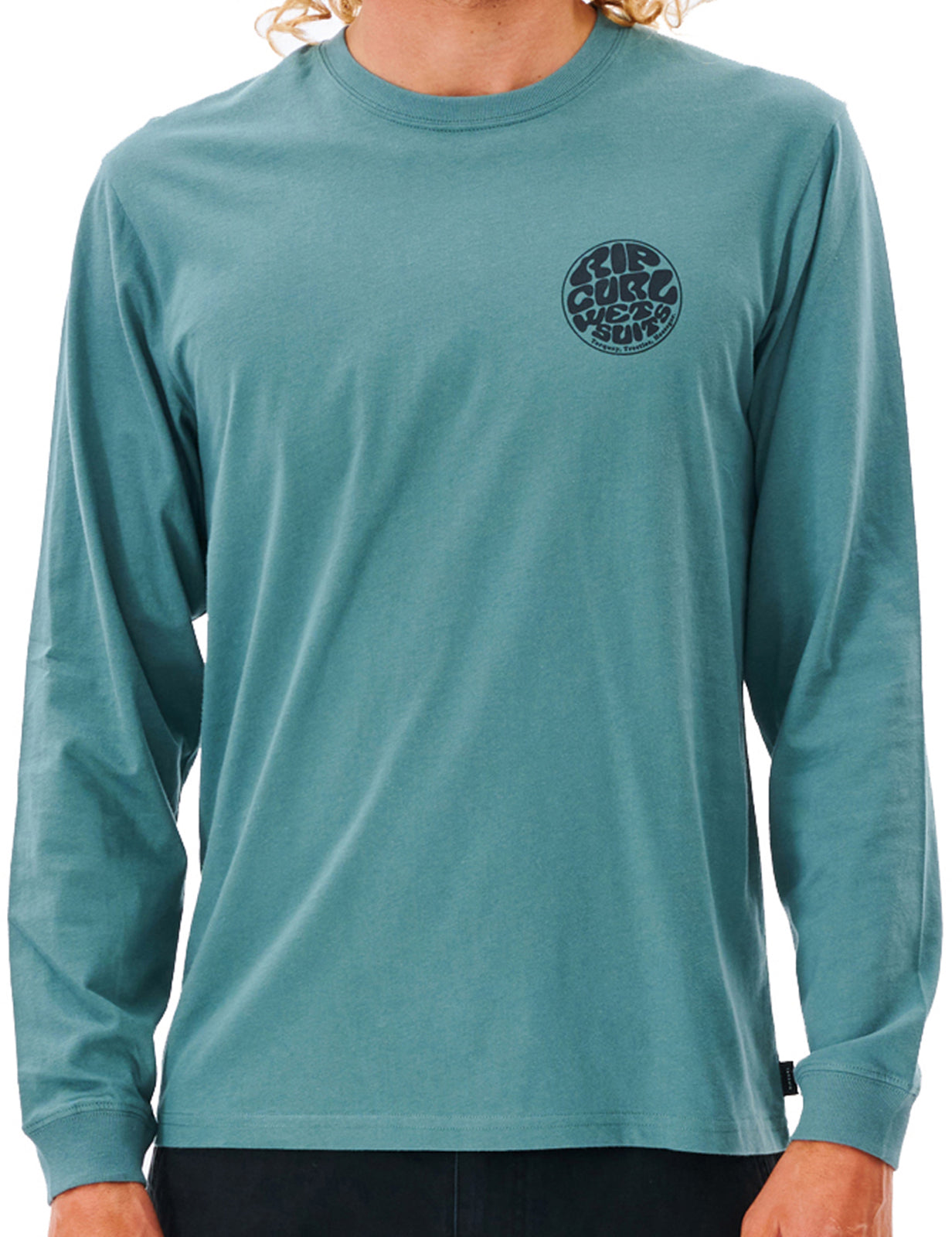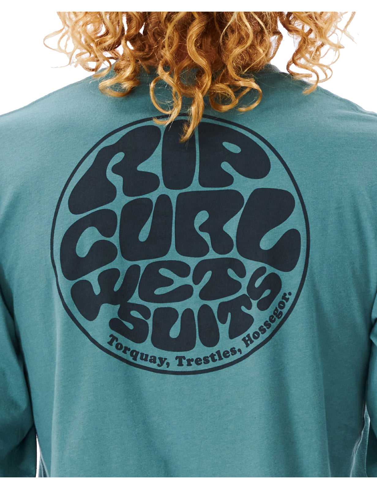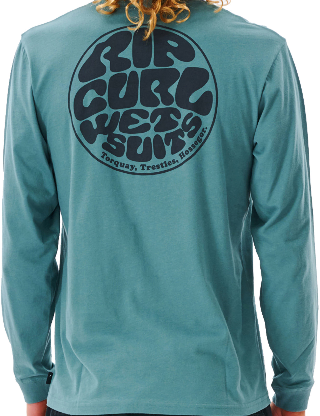 Rip Curl Wetsuit Icon regular fit long sleeve t-shirt in blue stone features a eco aware manufacture and rear print. Branding includes a Rip Curl logo chest print and Rip Curl woven label. Made with cotton jersey. Made from 100% organic cotton. Part of